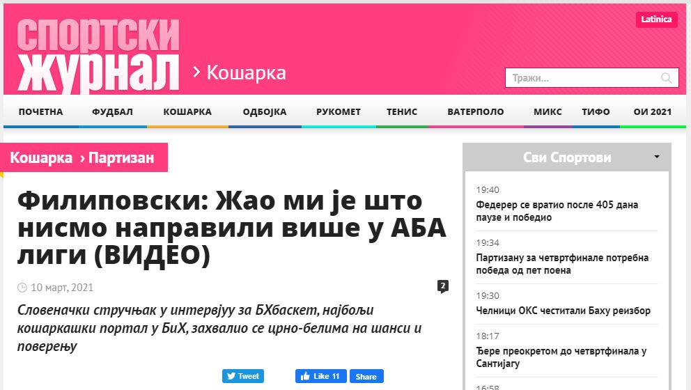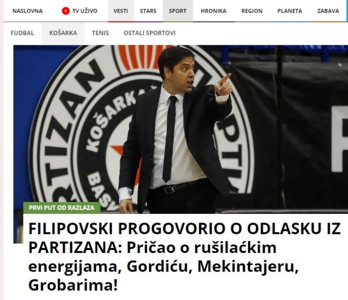 Današnji intervju sa donedavnim trenerom Partizana Sašom Filipovskim obišao je region. Pogotovo je čitan i prenošen u susjednoj Srbiji. Kao dokaz objavljujemo naslove tekstova koji su objavljeni na portalu: Sportskog žurnala, Monda, Kurira…