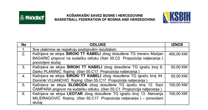 Košarkaški savez Bosne i Hercegovine objavio je odluke o kaznama nakon odigranog 1. kola MaxBet lige BiH. U fokusu se našla ekipa Široki TT Kabeli, koja je kažnjena u čak tri navrata.