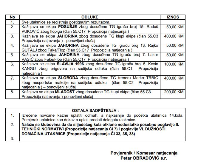 Komesar takmičenja u Ligi BiH Petar Obradović odredio je kazne za klubove na osnovu izvještaja službenih lica, a nakon 13. kola Lige Bosne i Hercegovine za košarkaše.
