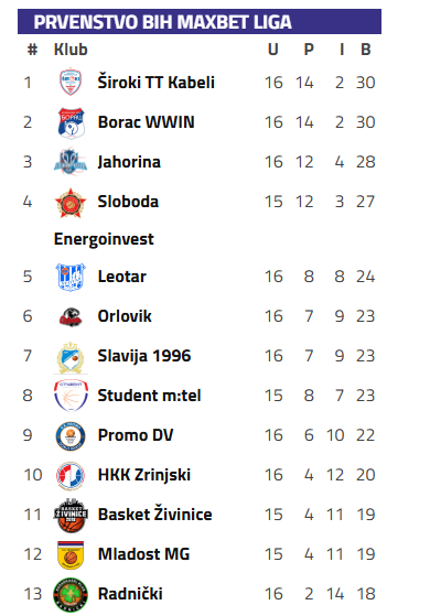 Tabela MaxBet lige Bosne i Hercegovine za košarkaše nakon odigranih 16.kola izgleda ovako: